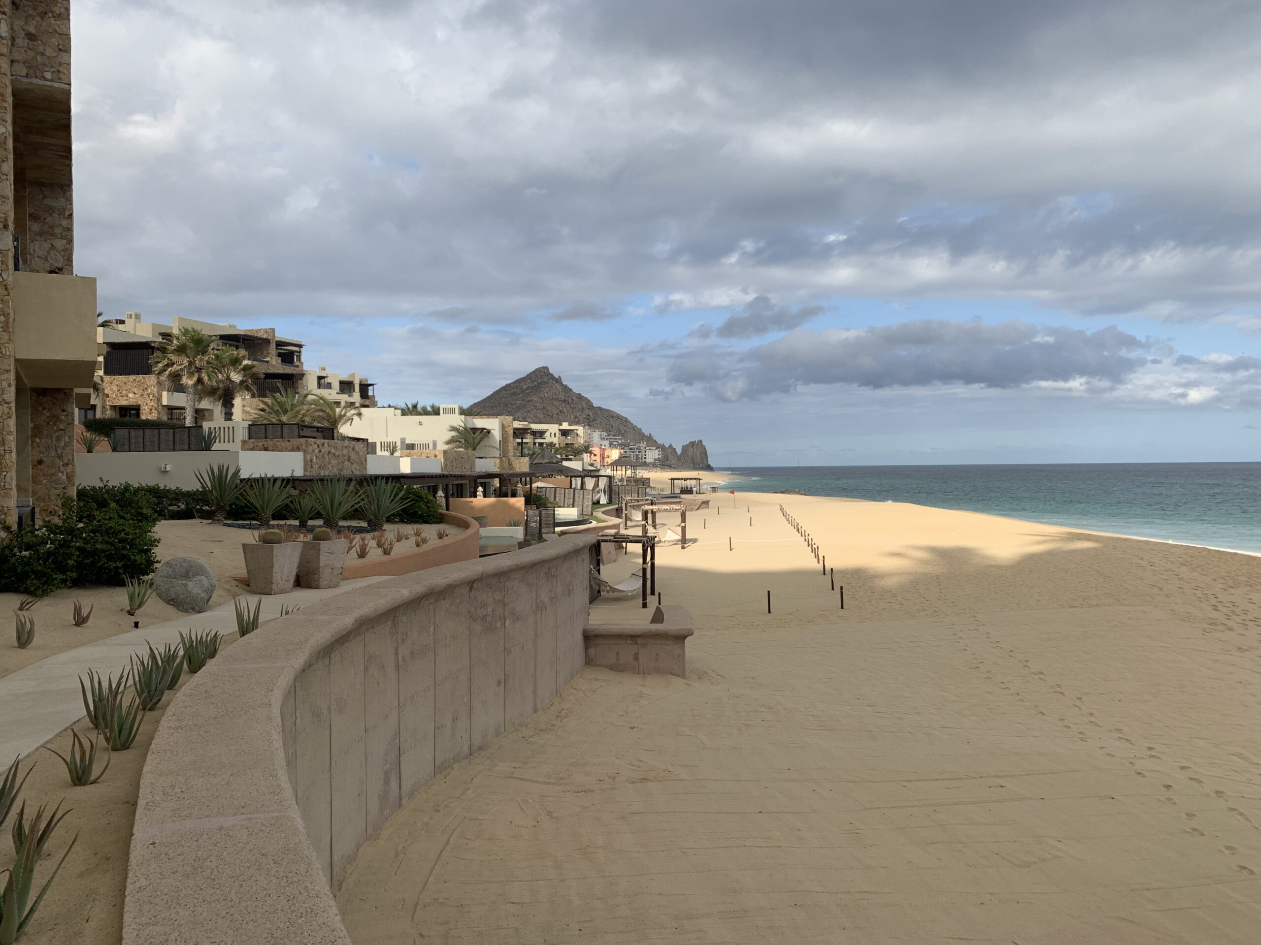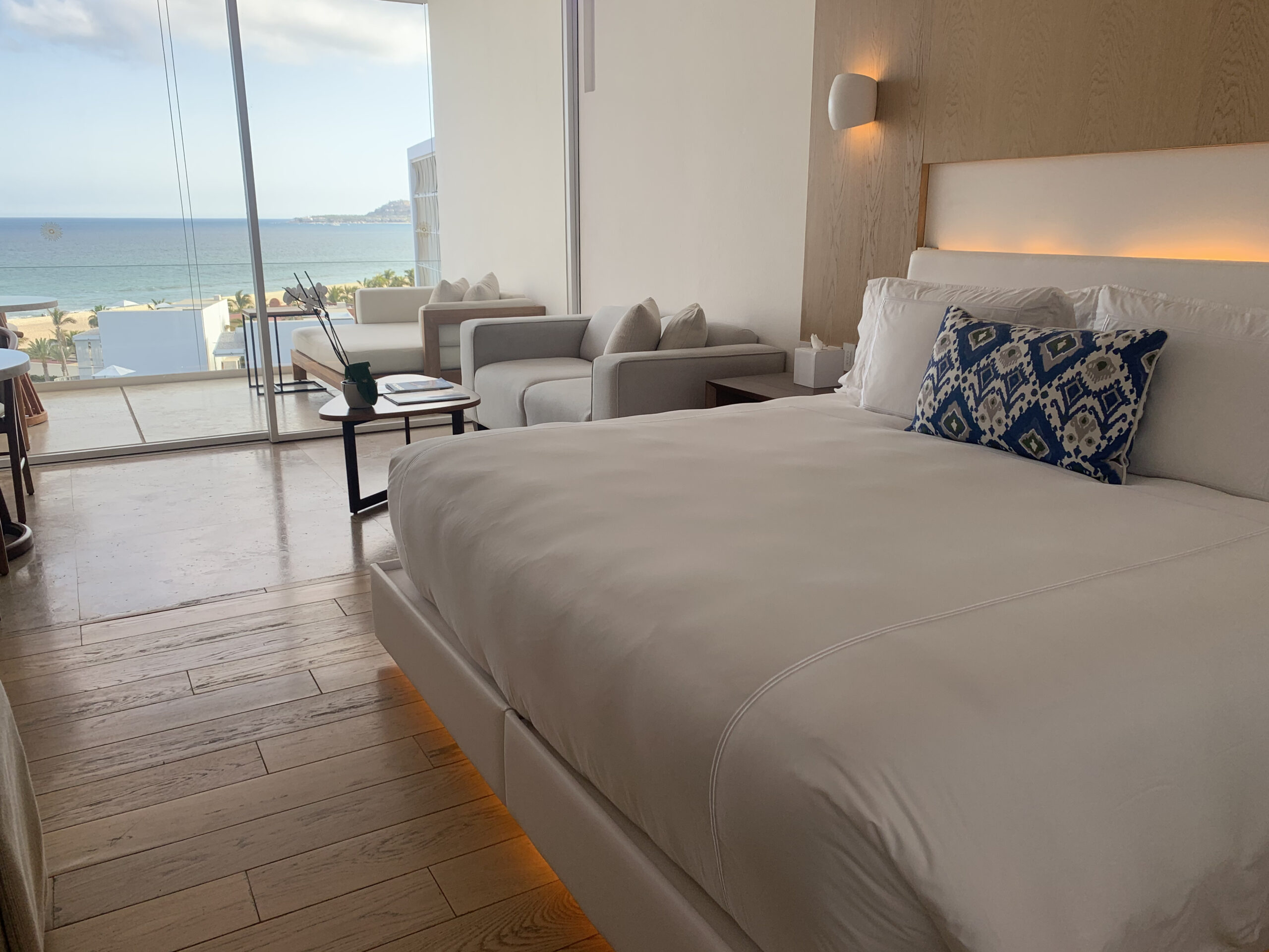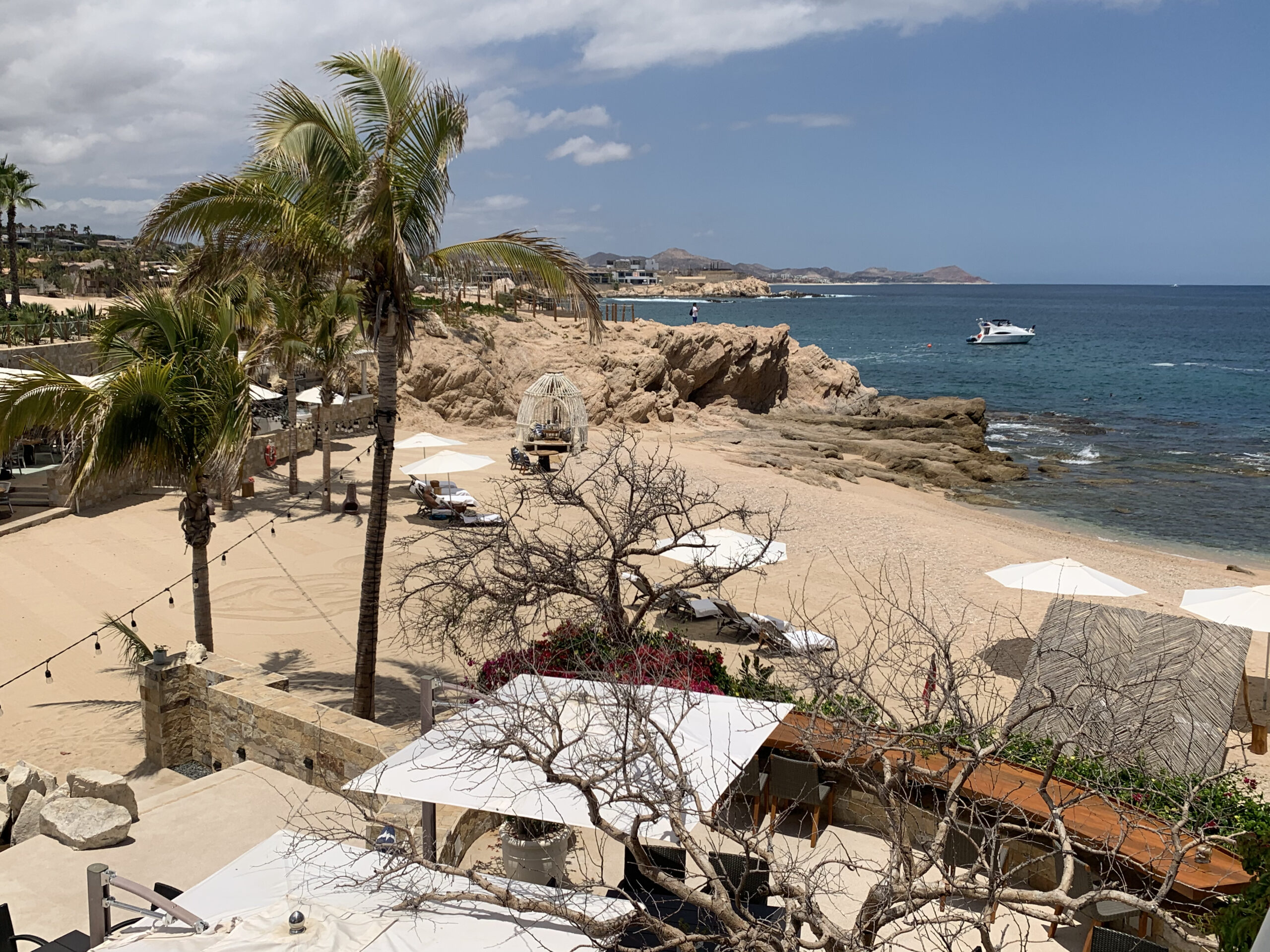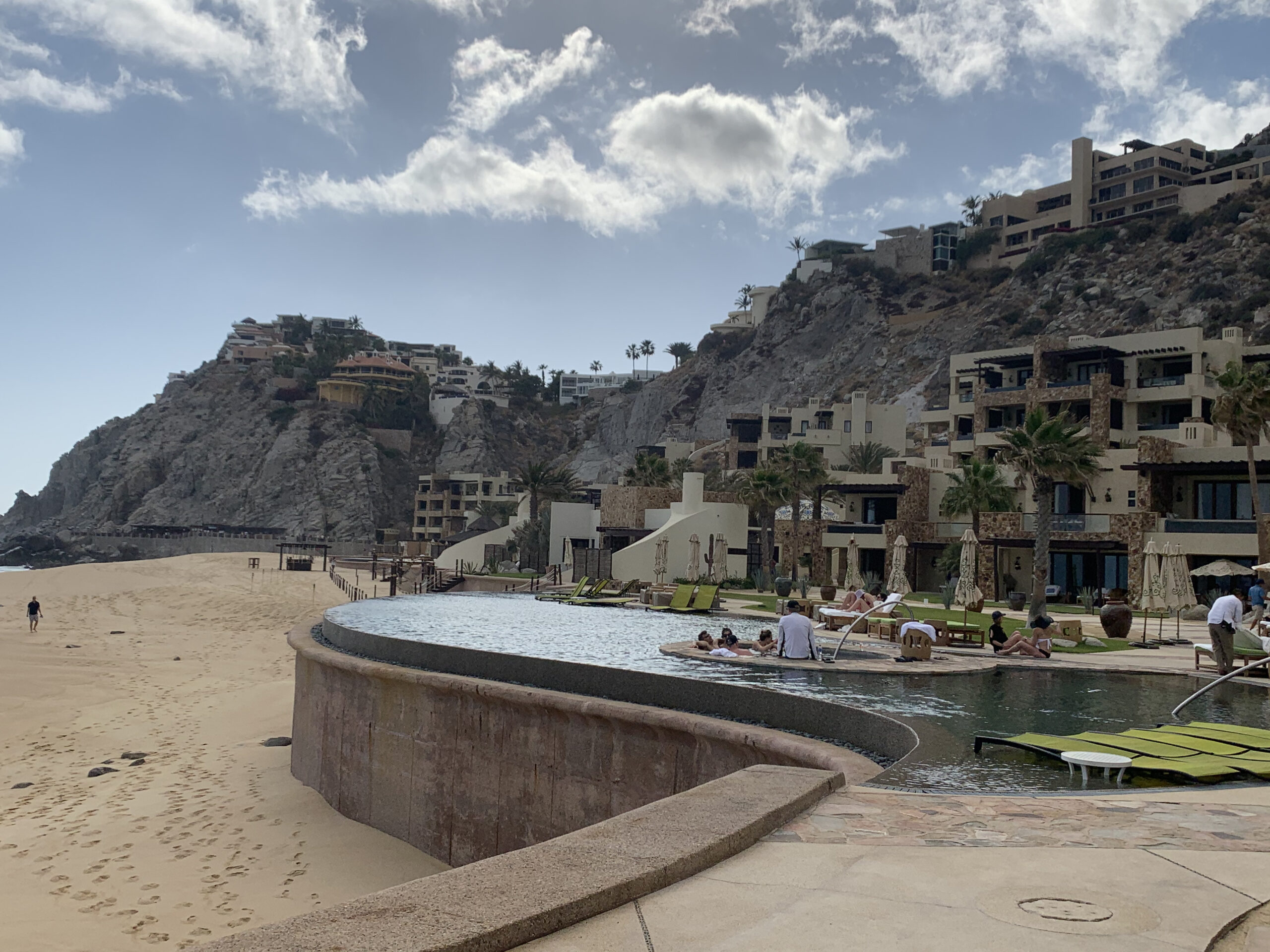 When you enter resort proper, the first thing you see is the mind-blowing three-level infinity pool that leads you directly to the beach. The first level is for kids, the second level is for families, and the third level is adults-only, offering something for everyone. The beach directly in front of the pools and the two restaurants is scenic but not swimmable. However, Chileno Bay does offer access to one of the most extensive swimmable beaches in Cabo. As with all beaches in Mexico, the swimmable beach is public, but the hotel has its own set up with loungers, umbrellas, and beach service. When we were at the hotel, the pool area was hoppin’, and it was by far the liveliest hotel scene we encountered on our scouting trip.