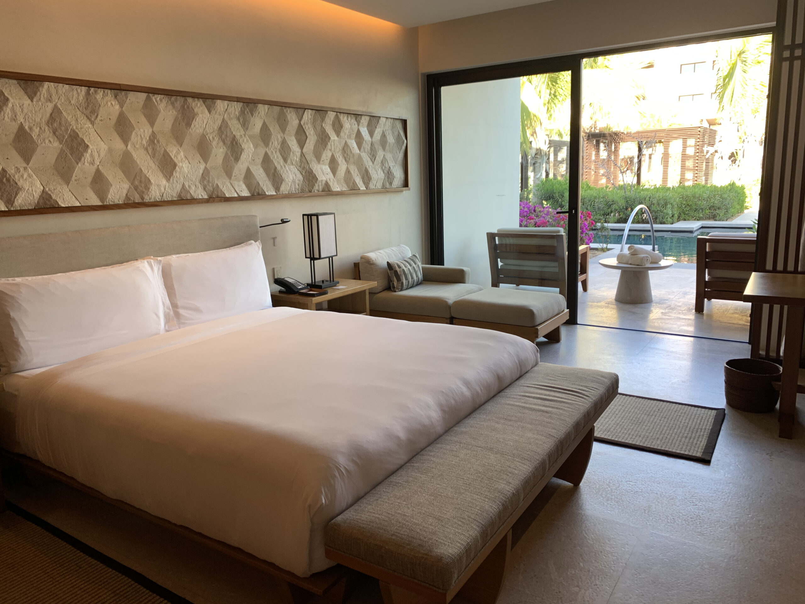 The hotel is unapologetically Nobu-like. Think clean, modern lines, minimalistic décor with a mixture of neutral and warm wood tones giving us a decidedly Japanese feel with a few well-chosen Mexican accents (artwork by Mexican artists, clever landscaping, and fire elements can be seen throughout the property). You will also struggle to find authentic Mexican food here – the hotel has three restaurants – the famous Nobu Los Cabos, Malibu Farms, and an Argentinian steakhouse (all excellent). The spacious, Japanese-inspired rooms are luxurious and very comfortable. For extra privacy – choose a room with a private plunge pool, and you will feel like you are in your own peaceful pod.